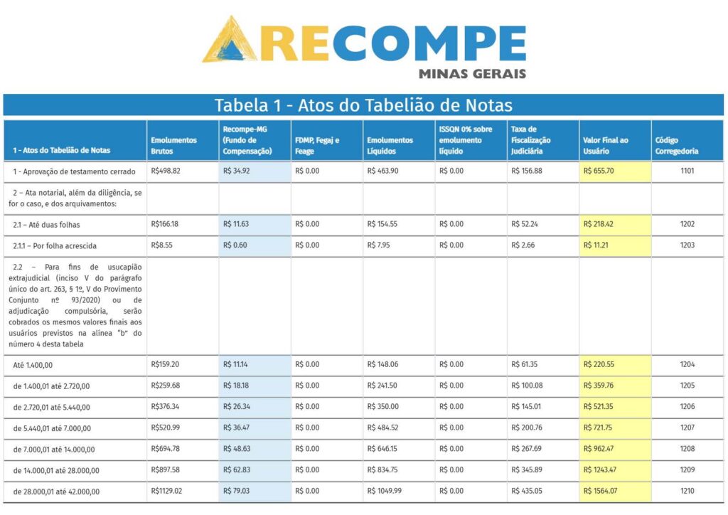 A Constituição Federal de 1.988, nos termos do art. 236, § 2º, delegou competência ao legislador federal para estabelecer normas gerais para fixação de emolumentos, o que foi levado a efeito pela Lei Federal n. 10.169 de 2000. O Estado de Minas Gerais, através da Lei 15.424 de 2004, e suas alterações, dispôs sobre a fixação, a contagem, a cobrança, o pagamento de emolumentos, recolhimento da Taxa de Fiscalização Judiciária e a compensação dos atos sujeitos à gratuidade. Os valores dos emolumentos, anualmente, são atualizadas pela aplicação da variação da Unidade Fiscal do Estado de Minas Gerais – UFEMG, prevista no art. 224 da Lei n. 6.763/75, ficando a cargo da Corregedoria-Geral de Justiça a publicação das respectivas Tabelas.